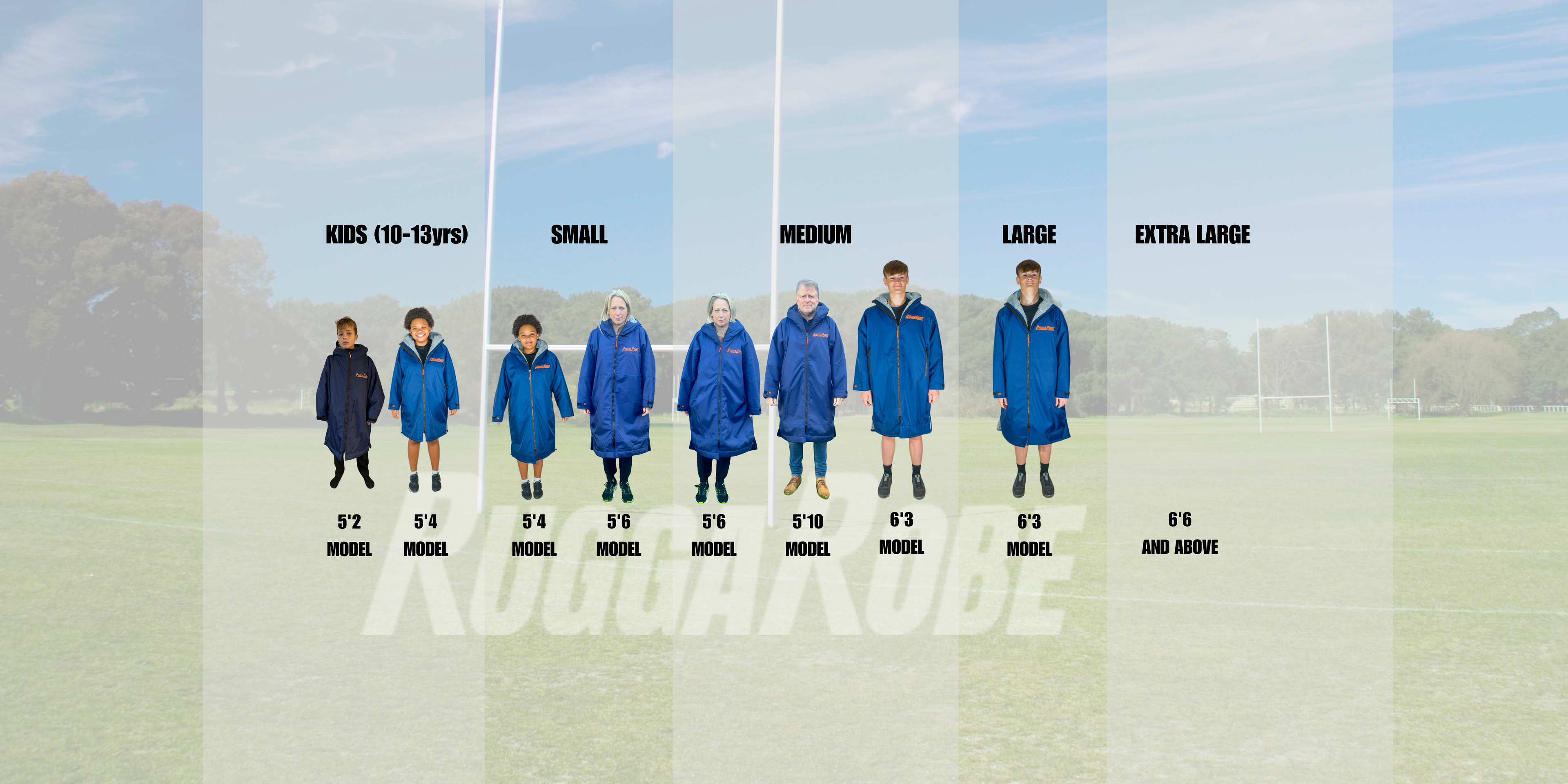The pictures below highlight that people can wear different sizes, depending upon the fit that they want. As an example, a lot of smaller women can wear a 10-13 robe but may want to size up to the small as it is longer and gives more protection to their legs when standing pitch side. The measurement table below highlights the key measurements of each robe and also details the key differences between the sizes.
