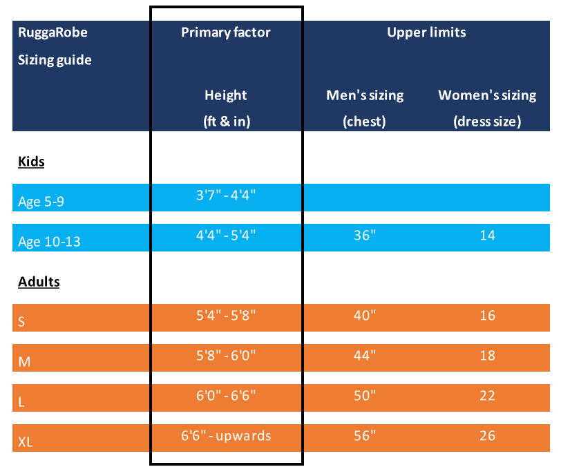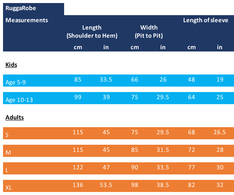 Our Ruggarobes are amazing, They're even better when they fit! Make sure that you've got the right size for you (or who you're buying for) before you check out.
