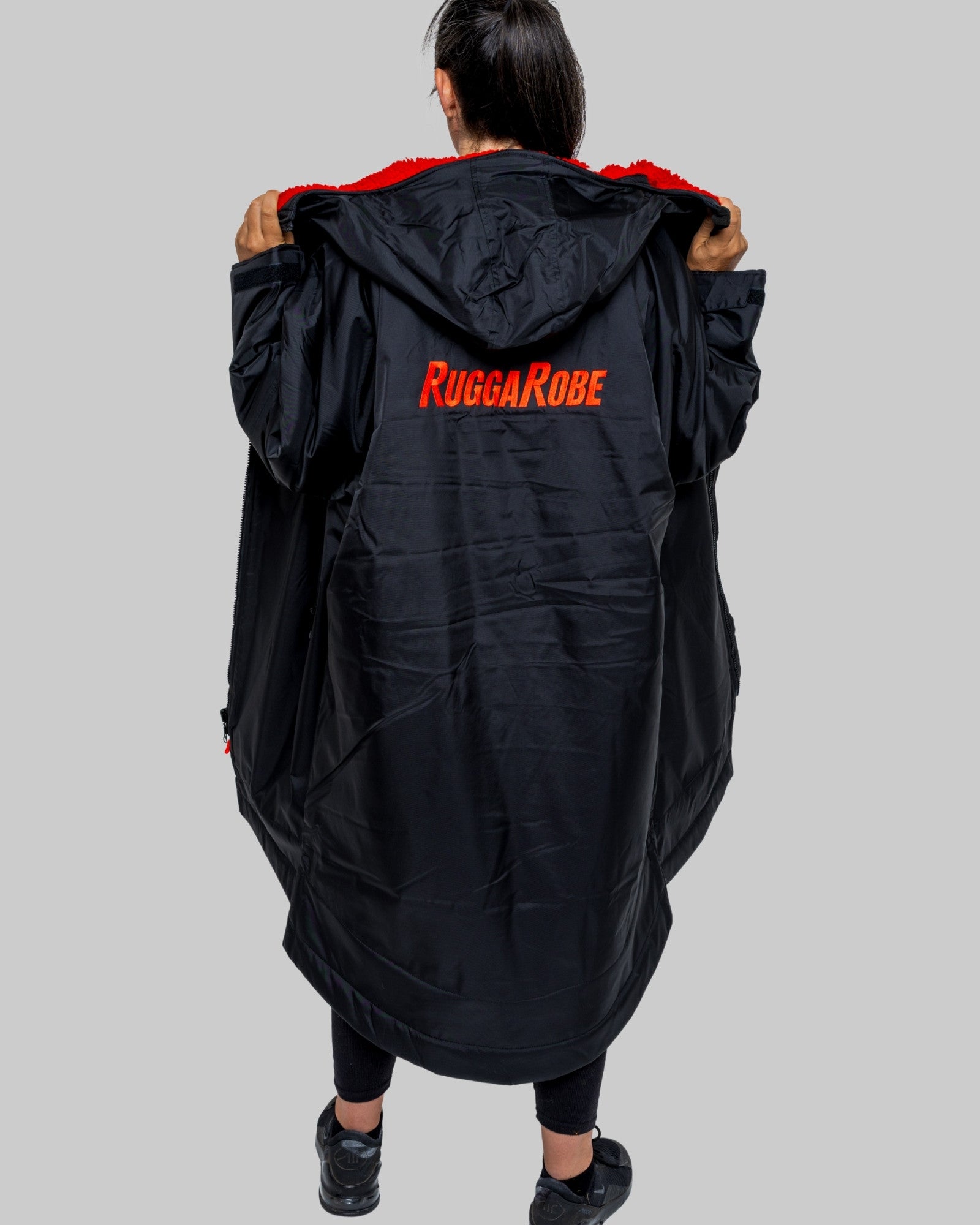 The oversized nature of the robes makes them ideal for changing underneath (traditional use of the robes) but also for use as a sub coat – where a range of body types and heights can fit into a robe and still keep the wearer warm and dry.  This oversizing, alongside the robustness of the robes, also means that kids can get years of use out of a robe.  All of our robes have long sleeves for extra warmth with Velcro straps to accommodate shorter arms (they look equally cool rolled up Miami vice style … we are showing our age now!).