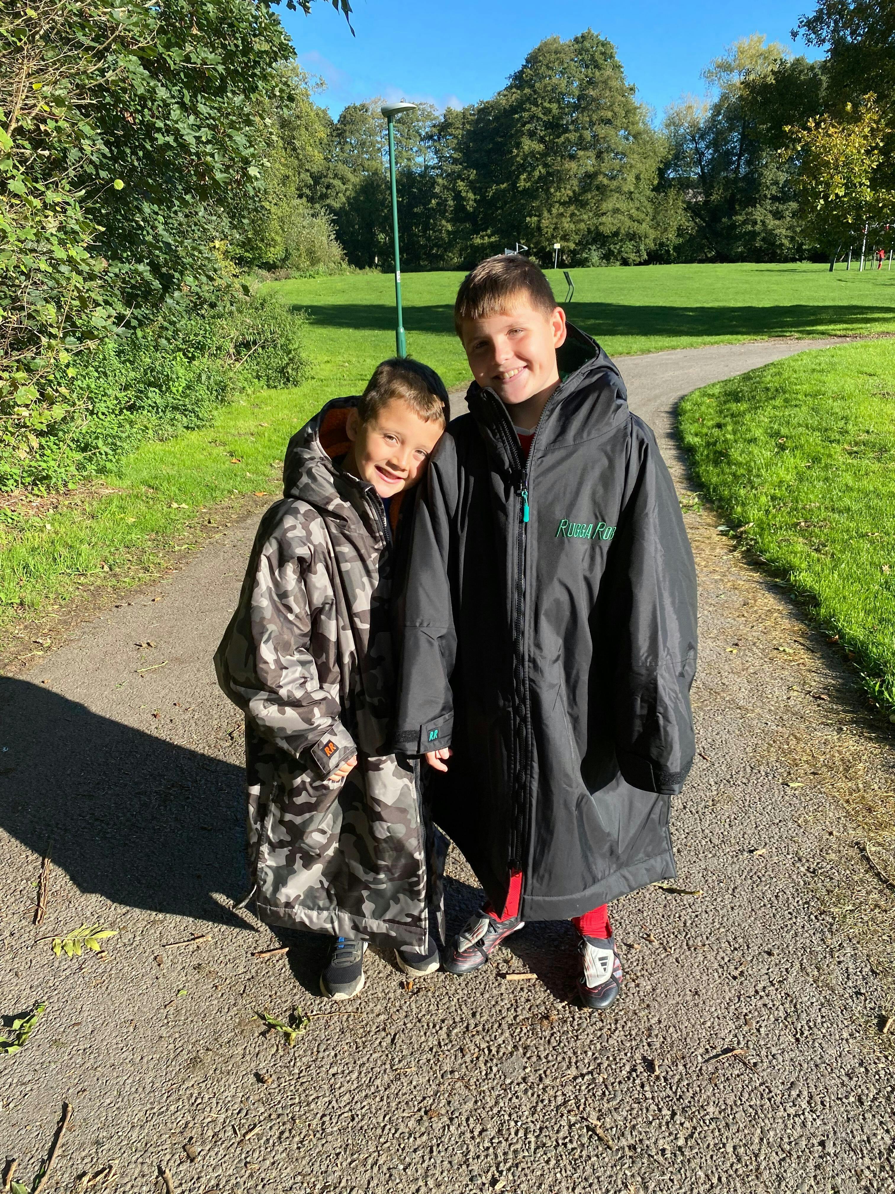 The oversized nature of the robes makes them ideal for changing underneath (traditional use of the robes) but also for use as a sub coat – where a range of body types and heights can fit into a robe and still keep the wearer warm and dry.  This oversizing, alongside the robustness of the robes, also means that kids can get years of use out of a robe.  All of our robes have long sleeves for extra warmth with Velcro straps to accommodate shorter arms (they look equally cool rolled up Miami vice style … we are showing our age now!).